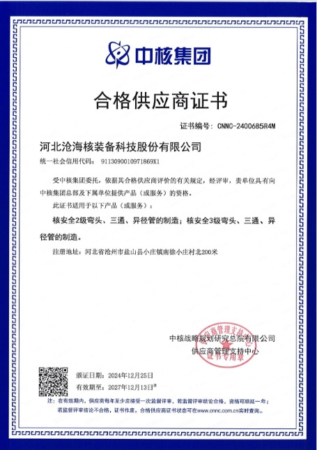 該合格供應(yīng)商證書的取得,是對河北滄海核裝備科技股份有限公司公司產(chǎn)品和綜合實(shí)力的肯定,標(biāo)志滄海核裝滿足核工業(yè)領(lǐng)域的相關(guān)要求。公司將以此為契機(jī),繼續(xù)堅(jiān)持創(chuàng)新驅(qū)動發(fā)展,加強(qiáng)與中核集團(tuán)的合作力度,為國家核電工業(yè)的發(fā)展做出貢獻(xiàn)。